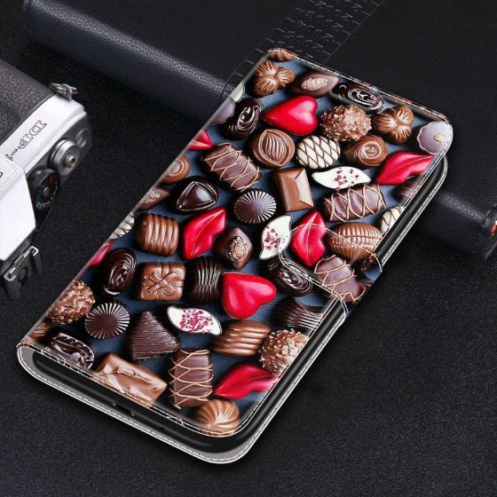 Preklopni etui je izdelan iz umetnega usnja. Poslikan je s čokoladnimi pralinami ki vas zapeljejo v skušnjavo. Omogoča popolno zaščito vašemu telefonu. Etui je zasnovan iz dveh delov: notranjega mehkega in upogljivega gela (TPU), kamor vstavimo telefon, ter zunanjega ovoja. Sama uporaba etuija spominja na odpiranje oz. zapiranje knjige. Na notranji strani etuija se nahajajo praktični žepki, v katere lahko vstavite denar, bančno kartico, mesečno vozovnico ali drug dokument formata kreditne kartice. Etui lahko stoji samostojno na ravni površini, tako, da je telefon v ležečem položaju pod kotom, kar omogoča priročno in enostavno uporabo za gledanje videoposnetkov ali fotografij. Predstavlja popolno zaščito za vašo napravo, saj ščiti pred umazanijo, praskami in udarci. Etui je primeren za vse, ki imate radi estetsko obliko in moderen izgled. Ovitek se popolnoma prilega in poskrbi za nemoteno povezljivost z napajalnim/podatkovnim kablom ter nemoteno uporabo vseh gumbov in rež.